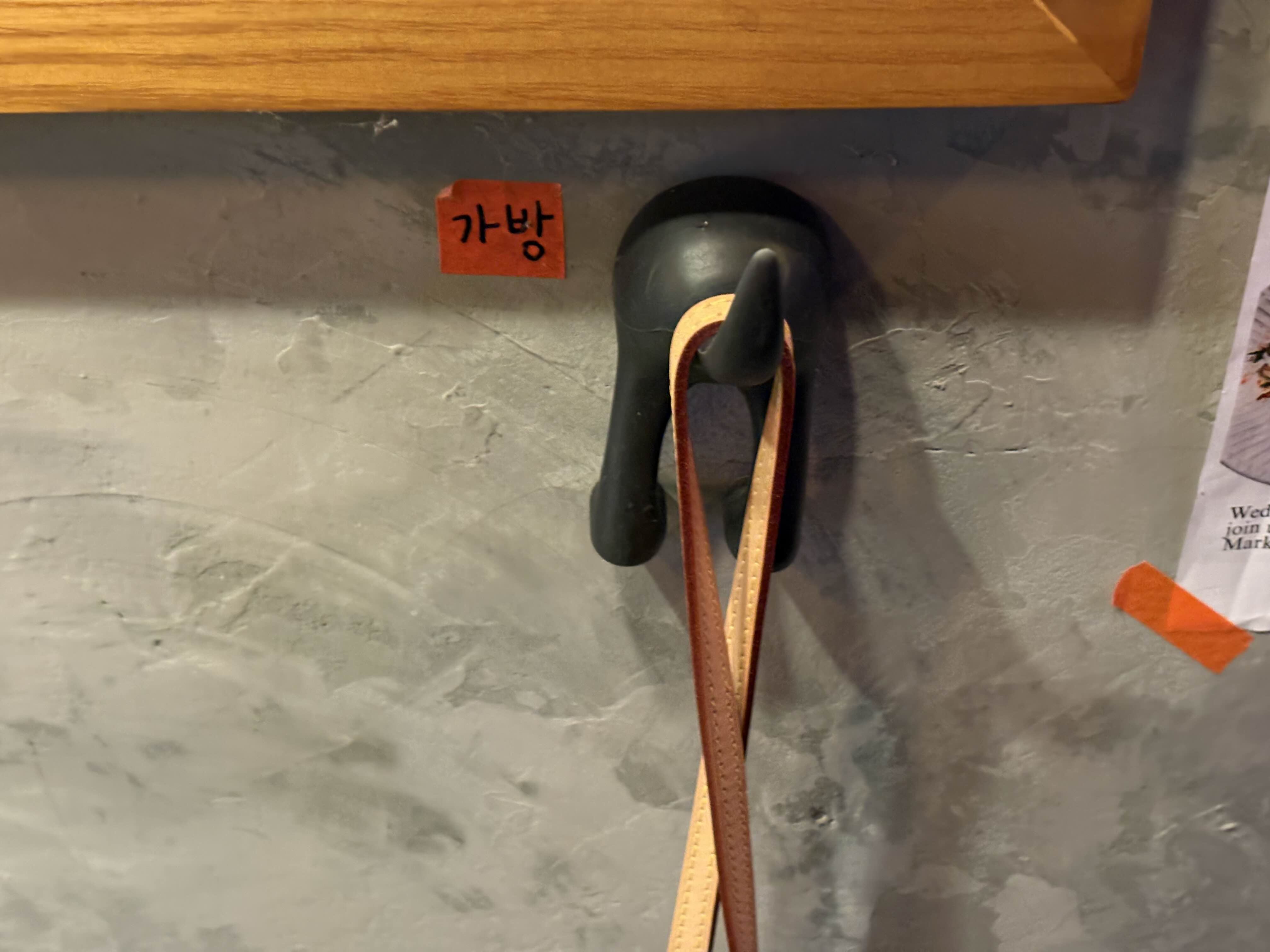벽에 깜찍한 가방걸이와 옷걸이가 붙어 있어 이용하기 편했습니다. 센스가 느껴지는 부분이었어요.