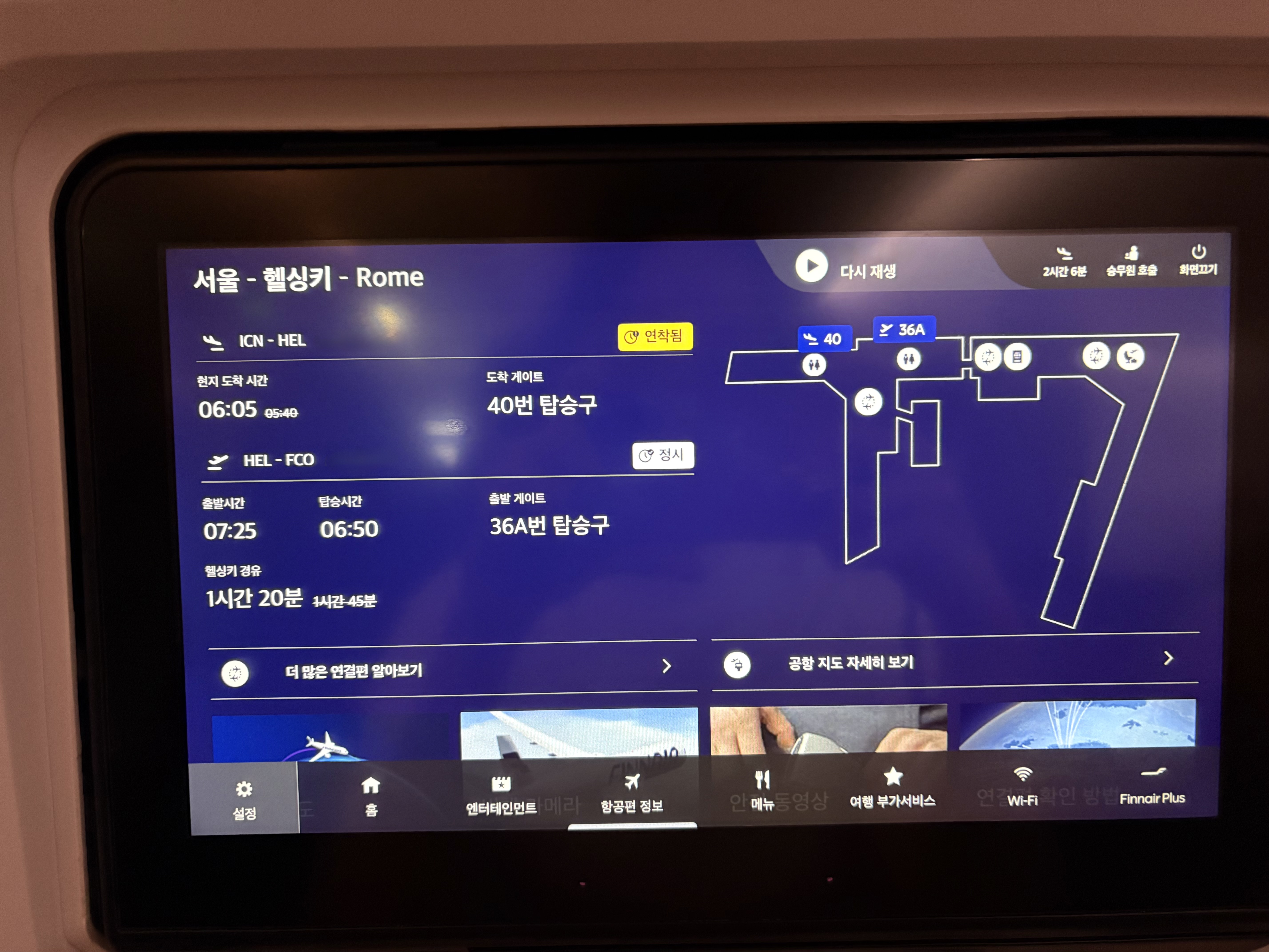화면으로 오늘의 메뉴도 미리 볼 수 있습니다. 기내식은 총 두 번 나오는데, 헬싱키 시간 기준으로 오후 6시, 오전 5시쯤 나옵니다. 최종 목적지인 로마와 헬싱키도 한 시간의 시차가 있다 보니, 아침은 굉장히 이른 시간에 먹게 됩니다.