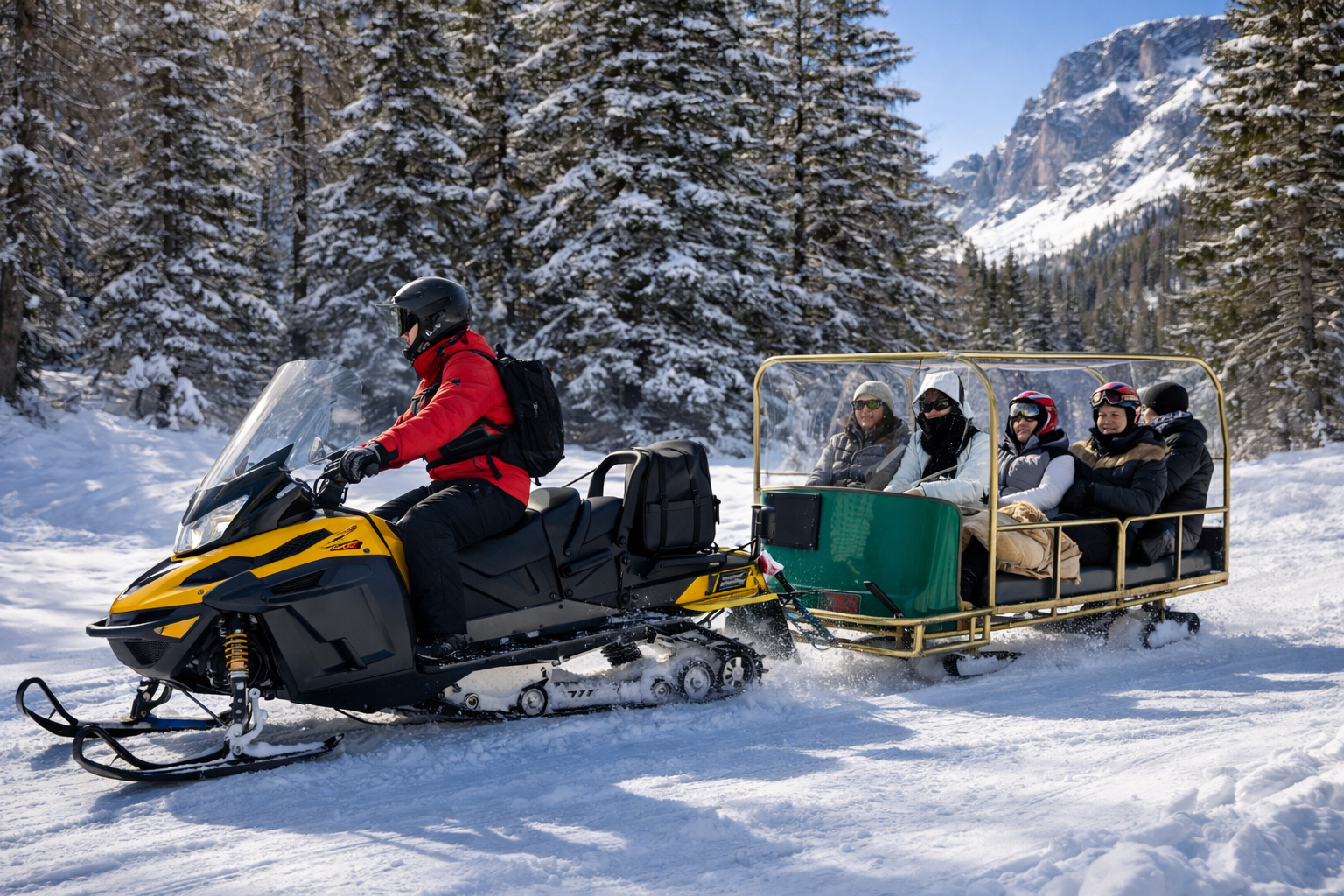 * 스노모빌 사진을 미처 못 찍어서 AI 사진으로 대체했습니다. 저렇게 앞에 조종석이 있고 뒤에 사람들이 타는 구조예요