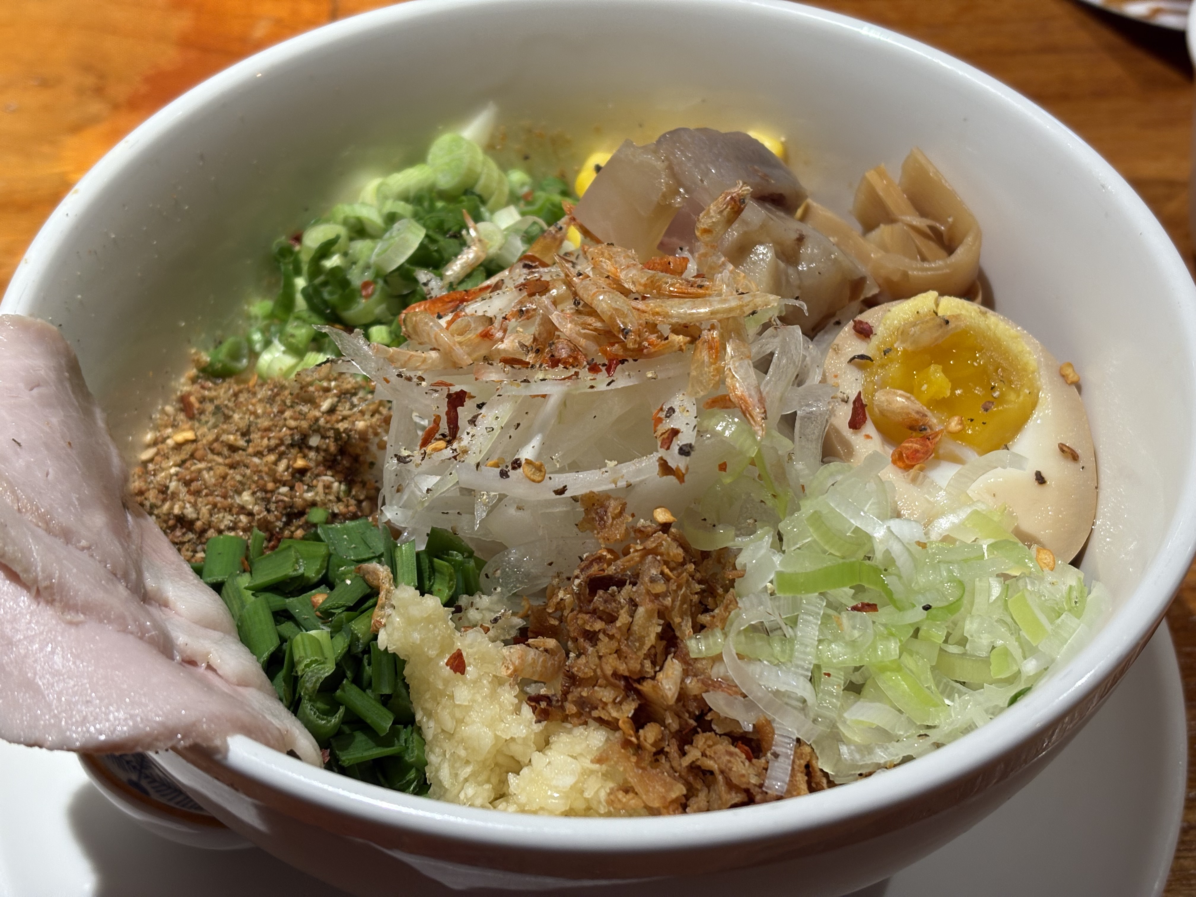 ✅ 아부라소바는 일본식 비빔라멘입니다. “기름(油, 아부라)” + “면(そば, 소바)”가 합쳐진 말로, 직역하면 기름국수쯤 될 것 같습니다. 보통 간장 베이스의 소스와 식초, 그리고 라유를 섞은 소스를 면에 비비고, 토핑들이 올라가 있는 형태입니다.